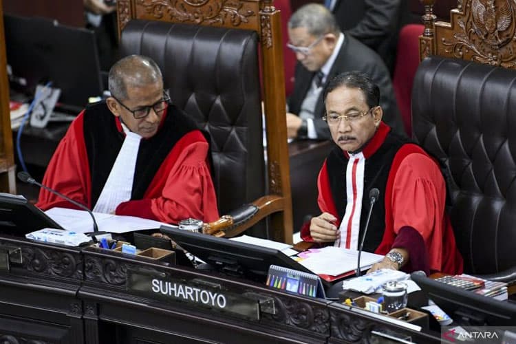 TIMES Lombok/Ketua Mahkamah Konstitusi (MK) Suhartoyo (kanan) bersama Wakil Ketua MK Saldi Isra memimpin sidang pengucapan putusan perkara dilanjutkan atau tidak (dismissal) sengketa Pilkada 2024 di Gedung Mahkamah Konstitusi, Jakarta, Rabu (5/2/2025). (ANTARA)